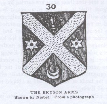 Photo-reproduction of arms recognized by Dr. John Ewing of the University of Pennsylvania, as belonging to his Scotch ancestors. The Ewing arms are on the reader's left,—sun, chevron, banner, &c. The figures on the right are those of other arms. Both originals of this and number two were used very early in America, and when the first American ancestors of our family were yet living. Now here is what Nisbet's work, revised in the 1804, 1816 edition, says: In our New Register Mr. Andrew Bryson of Craigton carried gules, a saltier between two spur-rowels in fesse, a spearhead in chief, and a crescent in base or. Plate 11, fig.30. This family ended in two daughters; the eldest of them was married to Walter Ewing, Writer to the Signet, father and mother of John Ewing, Writer to the Signet, who possesses the lands of Craigton, which belonged to the grandfather by the mother's side; and, by the father's side, he is the male representer of Ewing of Keppoch, his grandfather, in the shire of Dumbarton; which lands of Keppoch were purchased by a younger son of the family, who had only one daughter, married to John Whitehill, whose son Thomas possesses the lands of Keppoch, and is obliged to take upon him the name of Ewing. The arms of Ewing are carried by John Ewing of Craigton, Writer to the Signet, of which before, page 412. (Ib. p. 428.) That is quite a different story! I don't see how MacEwen, a barrister-at-law, practicing in one of Scotland's courts, made so great a blunder. Nisbet does not say that John Ewing carried the Bryson arms. Read his description of the Bryson arms, look at the photo-reproduction as Nisbet gives them in "Plate 11, Fig. 30," reproduced herewith, and it will readily be seen that the Bryson arms are not the Ewing arms. Not this only, Nisbet says plainly: The arms of Ewing are carried by John Ewing of Craigton, Writer to the Signet, of which before, page 412.