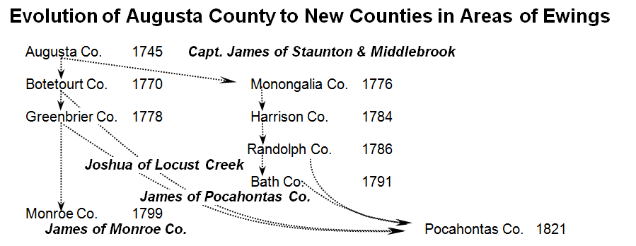 In addition to the confusion caused by there being numerous Ewing families, the Virginia counties and their boundaries were continually changing. In 1745 Augusta County encompassed almost all the land west of the Blue Ridge, down to the North Carolina / Tennessee line and west to the Mississippi River. The land that James Ewing of Monroe settled was first in Augusta County, then in Botetourt County, and then in Greenbrier County before becoming part of Monroe County. The early records are dispersed among these counties and other colonial and United States jurisdictions. Pocahontas James' records can be found in Augusta, Botetourt, Greenbrier, Bath and Randolph Counties before Pocahontas County. Further, the continuing movement of these settlers among areas amplifies the difficulty of tracing their records.